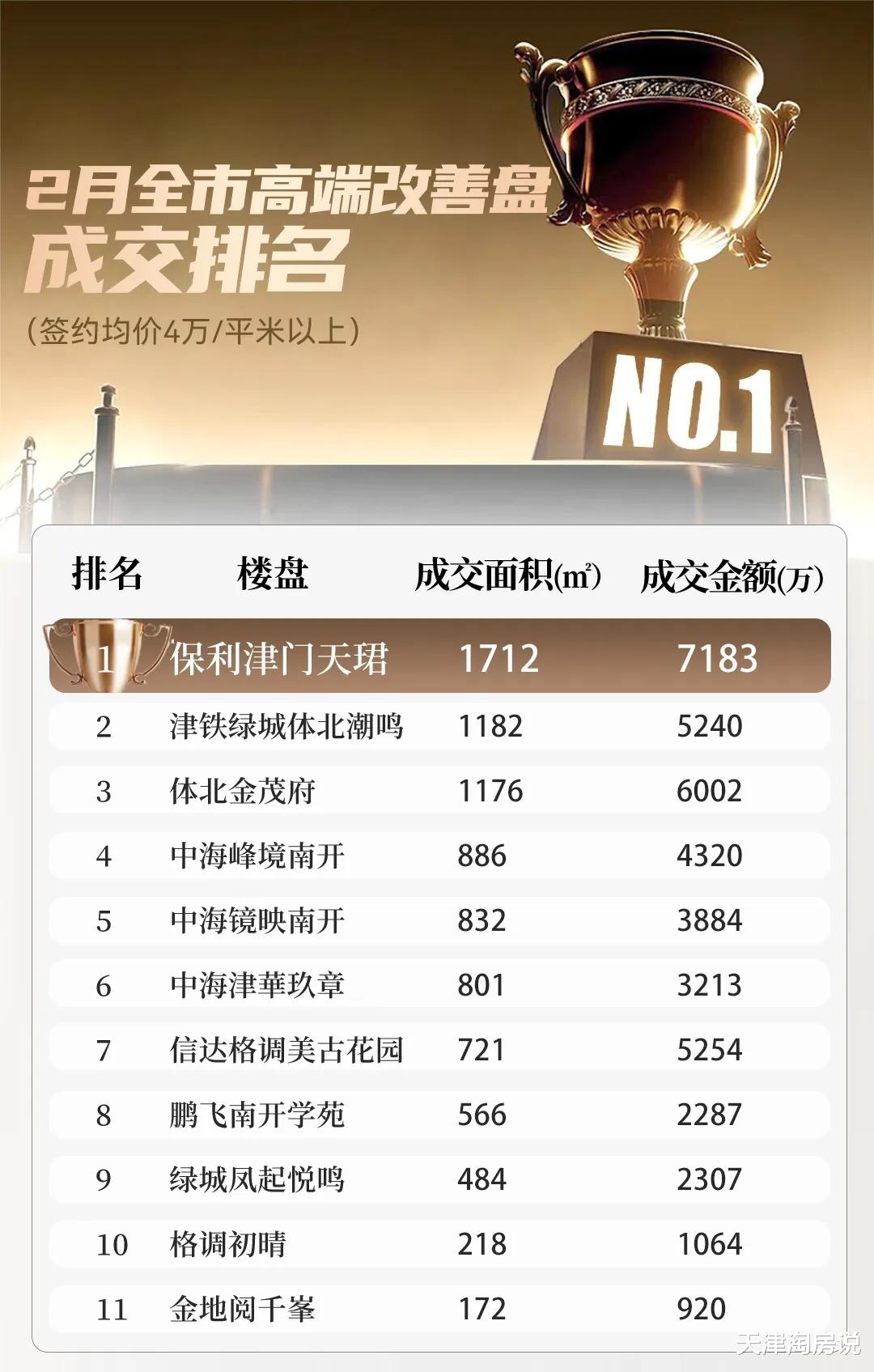 放眼全天津,在签约单价4万/平米以上的高端置业主场,保利津门天珺一举斩获了成交套数、成交金额、成交面积的三冠王。