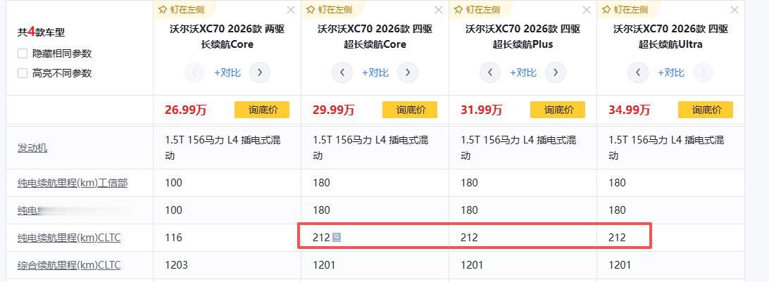 最后,我们再来看看价格。沃尔沃XC70限时参考尊享价从26.99万元起,这个价格在豪华新能源SUV领域不算高,并且提供了一些限时的购置税补贴、置换补贴等政策,以及针对三电系统的长期质保承诺(限时享购置税补贴,价值14000元 | 置换增购补贴,至高15000元| 三电系统终身质保,价值18000元),降低了入手门槛和后续用车的顾虑。