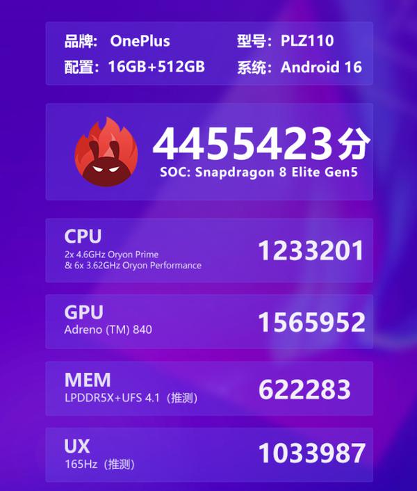 日前,安兔兔发布了一张型号为PLZ110的一加新机的跑分截图,根据此前曝光的信息推测,该机大概率就是传闻已久的一加15T新机。测试该机性能的安兔兔版本是V11,其除了综合成绩达到了4455423之外,各项成绩也都不低,其中CPU成绩为1233201、GPU成绩为1565952、MEM 成绩为622283、UX成绩为1033987。据此前爆料看,该机定位“全能小钢炮”和“小屏大魔王”,主打极致设计、性能与续航平衡。
