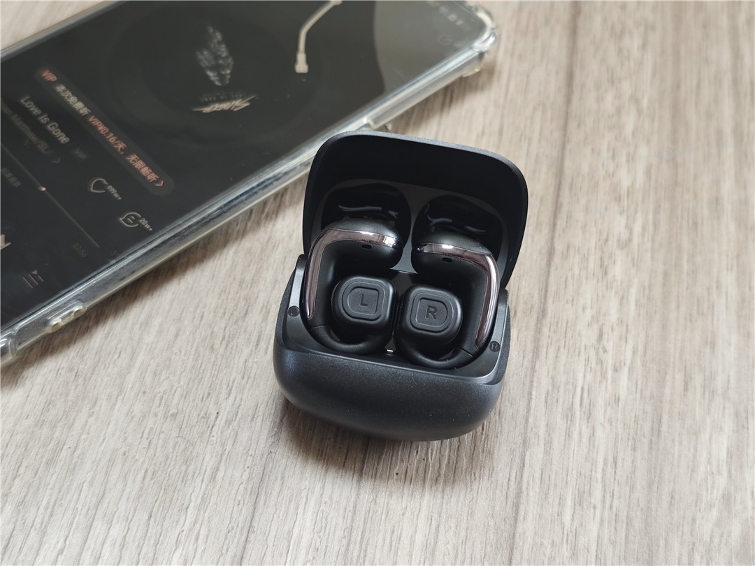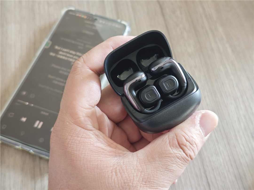 取出耳机的第一感觉就是 “轻”!单只耳机比我平时用的蓝牙耳机轻了快一半。捏在指尖几乎没什么重量,甚至有时候忘了自己还戴着耳机。最让我满意的是耳夹部分的设计,不是那种硬邦邦的塑料,而是有一定弹性的亲肤材质。第一次戴的时候,我还担心会夹耳朵,结果戴上后完全没有压迫感,调整好位置后,即使摇头也不会掉。