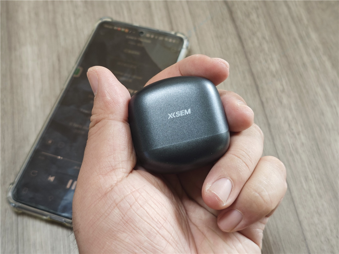 取出耳机充电盒, 磨砂质感的外壳,摸起来细腻不沾指纹,耳机电池盒的配色是我喜欢的磨砂黑,表面没有多余的装饰,只有一个小小的指示灯和西圣的 logo,看起来很简约高级。