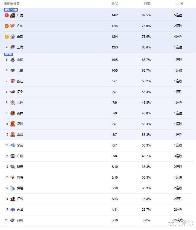最新积分榜出炉,排在前四位的球队分别是广厦队、广东队、青岛队、上海队,山东和北京都是10胜5负,分列第五位和第六位。排在第七位到第十位的球队分别是浙江、辽宁、北控和吉林。