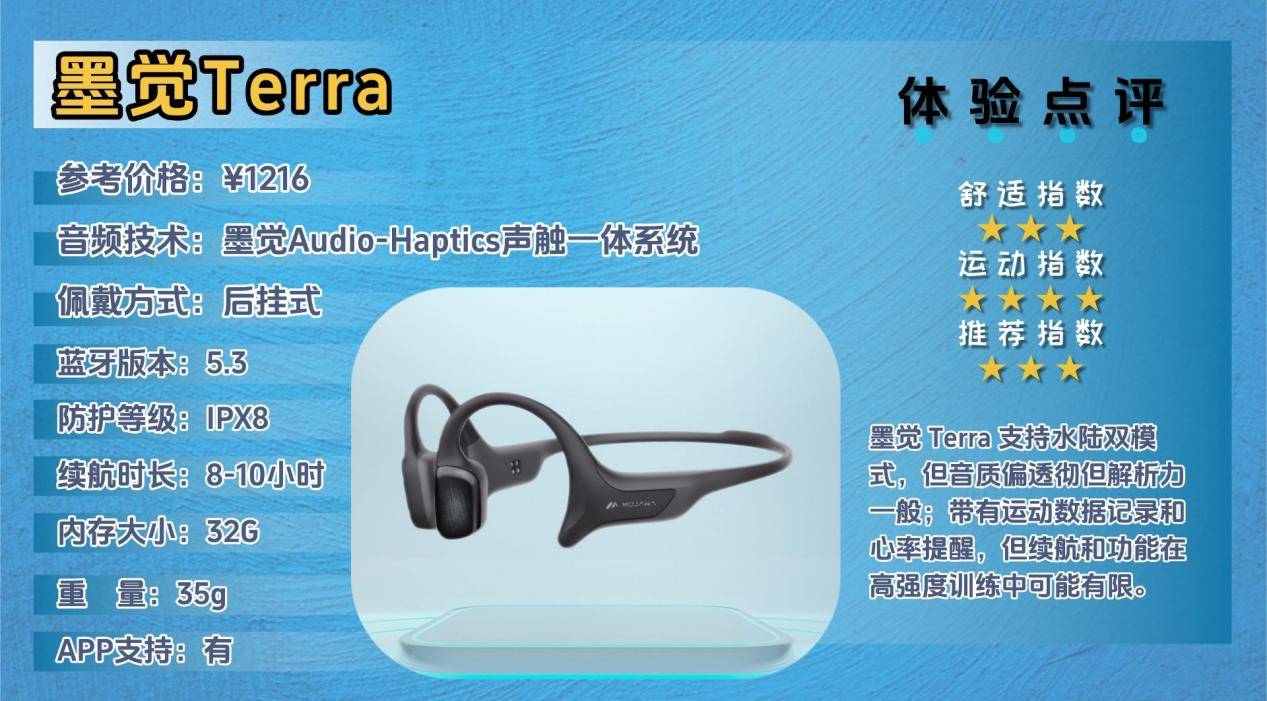 墨觉Terra定位为偏专业训练辅助的骨传导运动耳机,核心不只在听歌,而是结合运动数据记录、语音/振动反馈,面向对训练监控和水陆多场景有需求的用户,整体偏功能型而非轻量日常型。