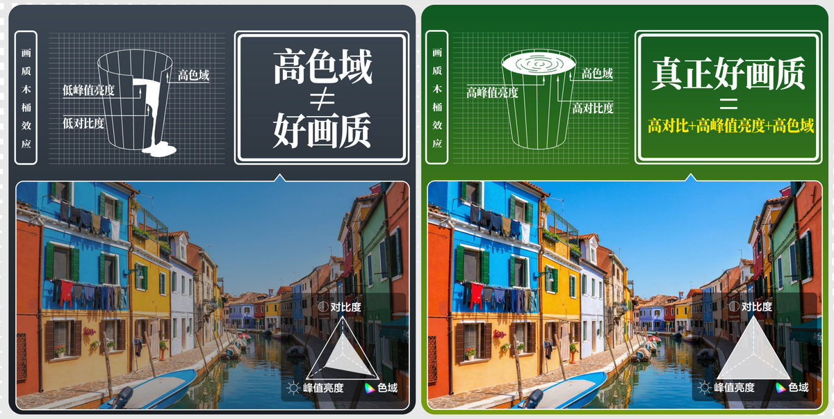 选电视,先看懂“画质铁三角”在聊这台机子之前,先跟大家科普一个我测评时最看重的标准:真正的好画质,取决于高对比度、高峰值亮度、高色域这个“画质铁三角”,三者缺一不可。