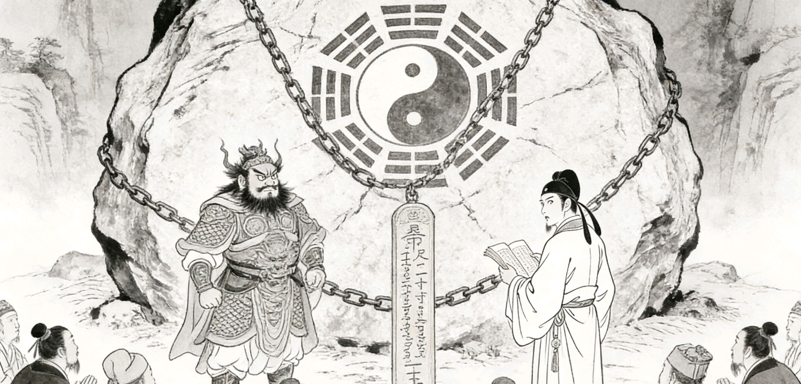 赵公明惊醒,急往县学,果见八卦图与玉简相合。次日,赵公明率百姓至锁龙涧,见涧中巨石上,果有锁链痕迹,深入石中。百姓皆叹曰:“大禹之功,千秋不朽;伏羲之恩,万代不忘。”