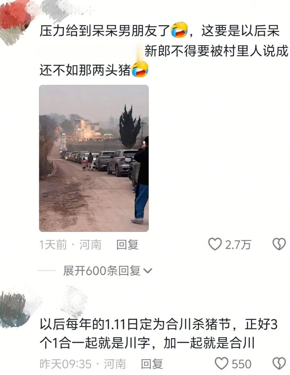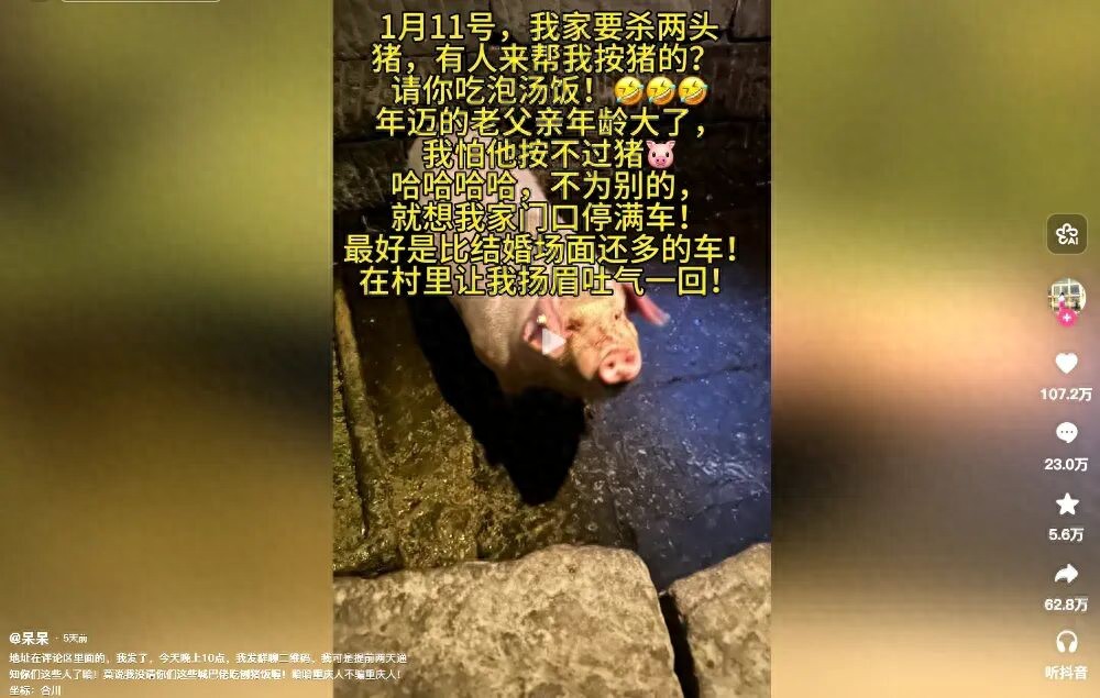 重庆合川的“呆呆妹”发出一句朴素又带点撒娇的求助:“我家要杀年猪,谁来帮我按猪?请你吃刨猪汤。”