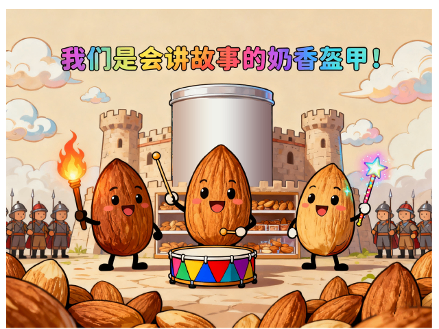 用这样的西域童话,让现烤巴旦木在货架敲响手鼓:“我们是会讲故事的奶香盔甲!”