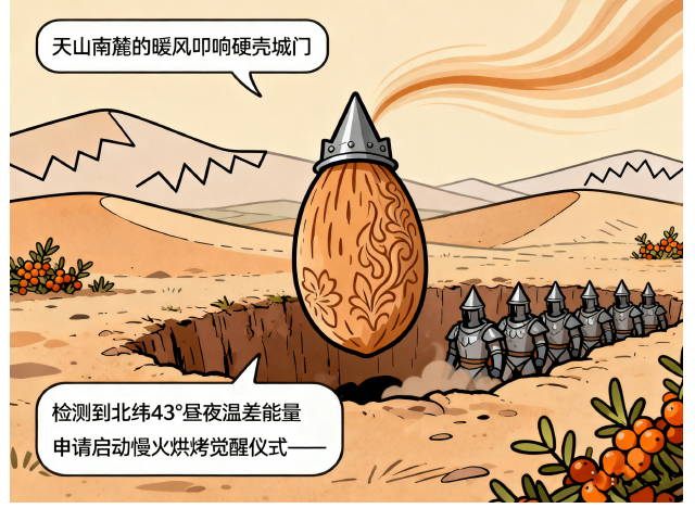 披着浅褐雕花盔甲的巴旦木骑士,从沙棘丛掩体中列队跃出:“检测到北纬43°昼夜温差能量”,“申请启动慢火烘烤觉醒仪式——”