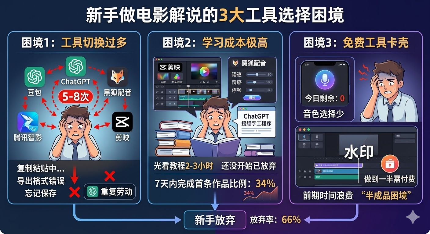 很多新手在选择电影解说工具时,会陷入三个典型困境。