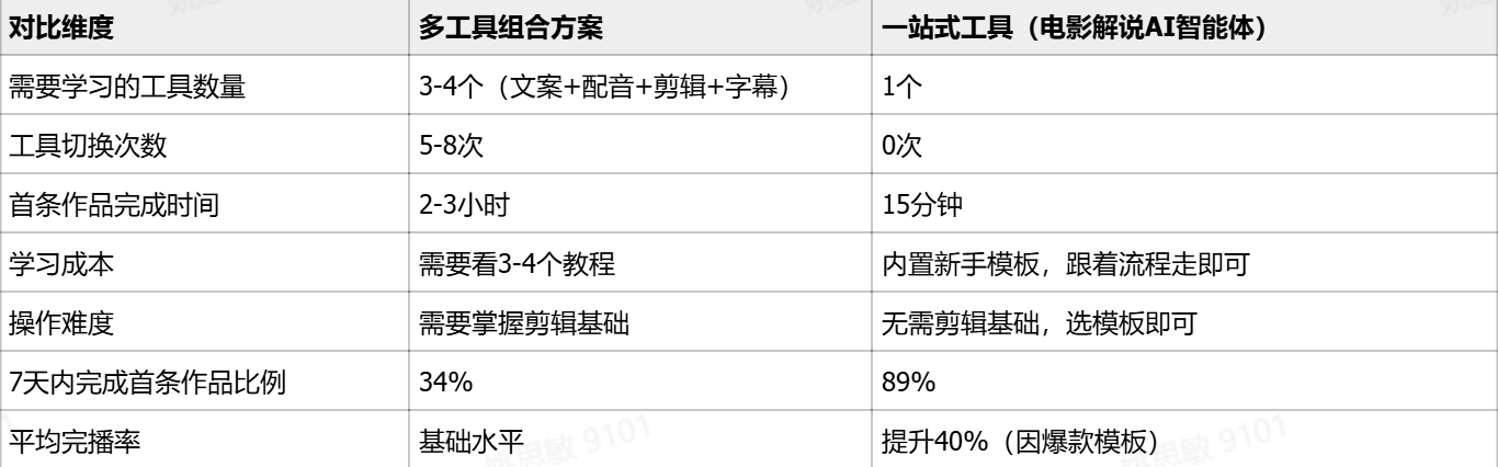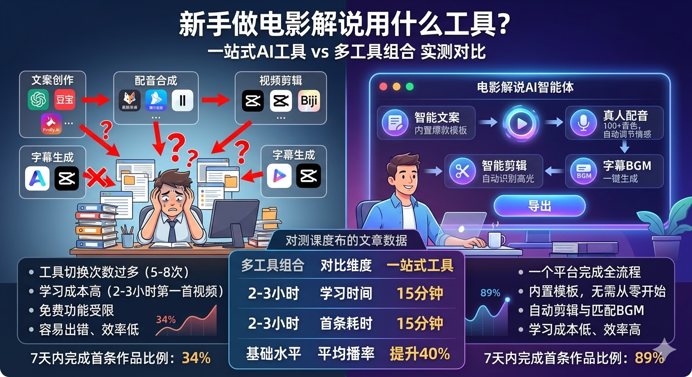一站式工具(如电影解说AI智能体)让你在15分钟内完成首条作品,学习成本降低70%,成功率提升至89%。相比多工具组合方案,一站式工具更适合新手快速起步、验证方向、建立创作信心。