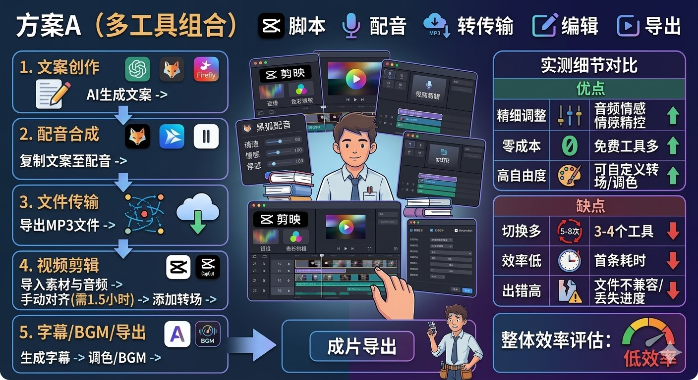 困境1:工具切换次数过多,容易出错用豆包或ChatGPT写完文案,需要复制到剪映。配音又要打开黑狐配音或腾讯智影,导出音频再导入剪映。整个流程需要在3-4个工具间切换5-8次,新手经常忘记保存文件或格式不兼容,导致重复劳动。