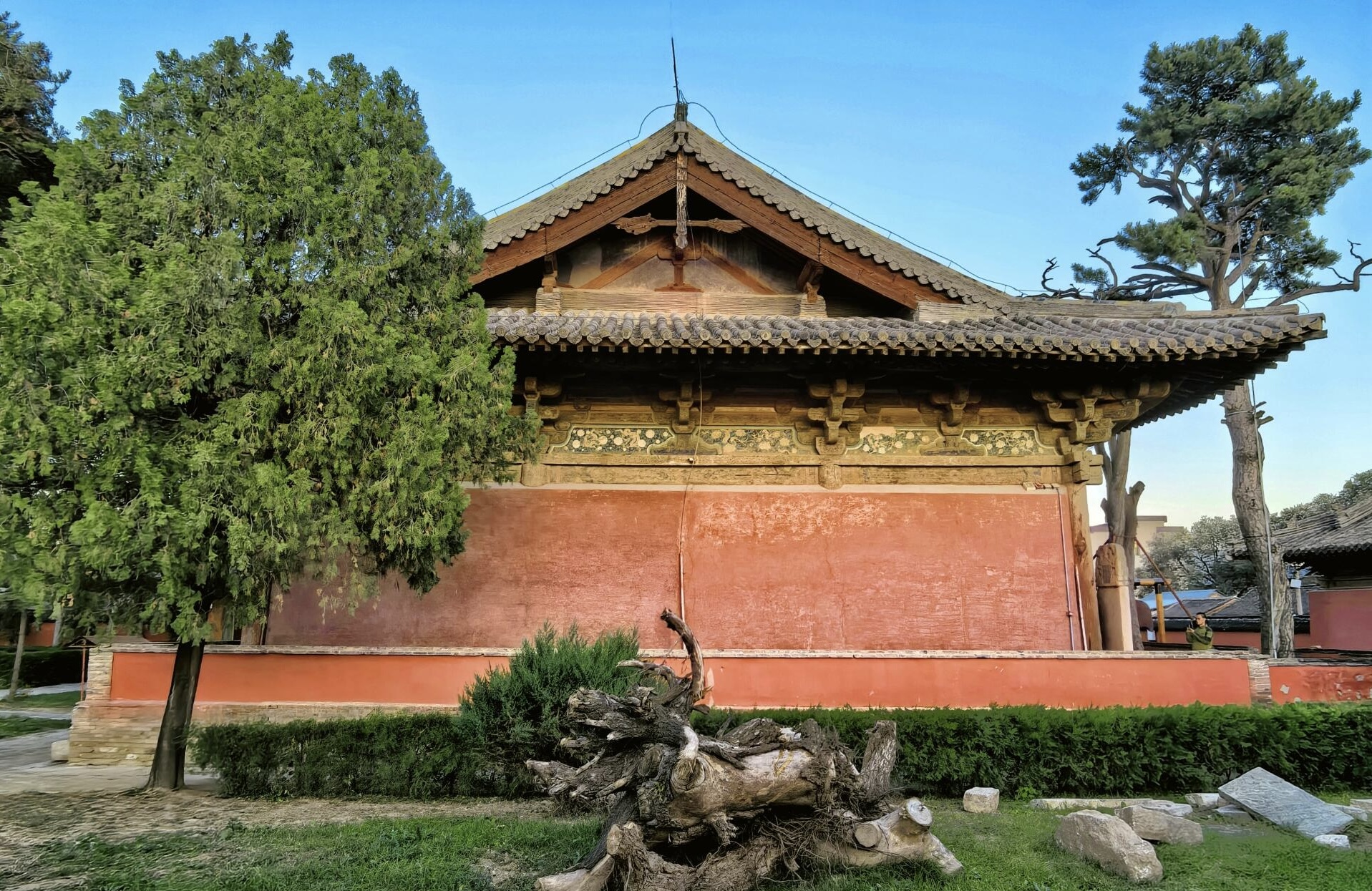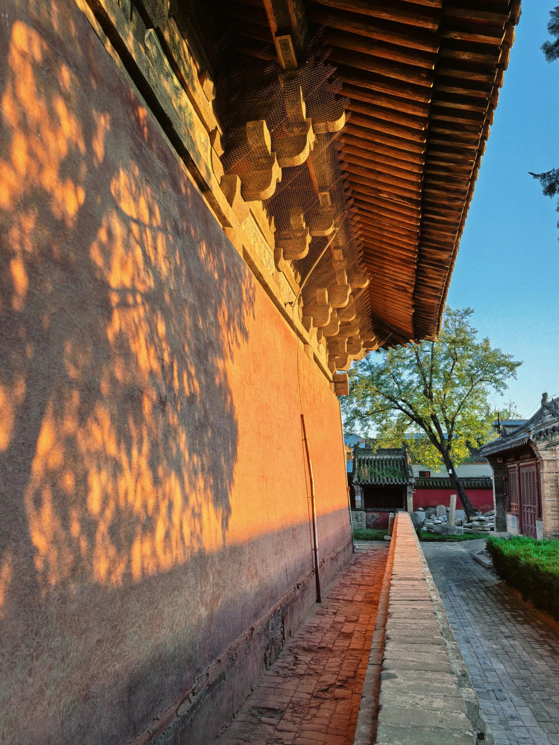 跨进门槛的瞬间,我突然理解了为什么古人建寺庙要讲究“藏”。眼前的文殊殿明明只有三开间,放在别的寺院里可能只配当个偏殿,可往这儿一站,你会觉得它比任何七开间大殿都更有压迫感。夕阳正斜斜地打在殿顶的琉璃瓦上,那些绿的蓝的釉色被晒得发烫,像一块被太阳烤软的宝石。檐角的风铃没响,倒不是风停了,是声音被殿宇本身的气场吸走了,连空气都变得沉甸甸的,每一口呼吸里都像掺了千年的木屑味儿。