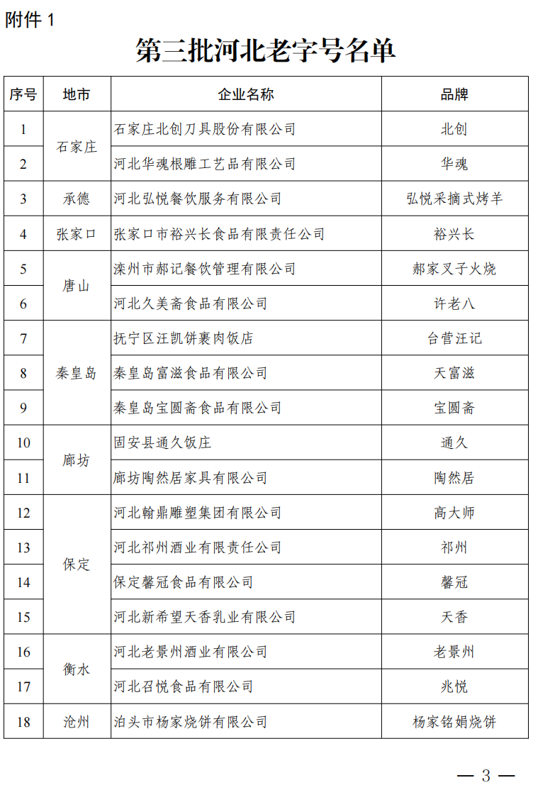 河北省商务厅等4部门关于公布第三批河北老字号名单和第一批河北老字号通过复核名单的通知