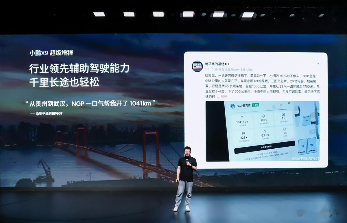 小鹏 X9 超级增程行业第一梯队的辅助驾驶能力,赢得用户高度青睐。拥有2250 TOPS顶级算力,可实现从高速到城区的全场景辅助驾驶覆盖,将驾驶者从疲劳中解放。强大算力更支撑VLM私人管家和全场景VLA功能,让车机系统更智能、更人性化。用户实测小鹏X9超级增程从贵州到武汉1041km一口气直达,未补能未接管。