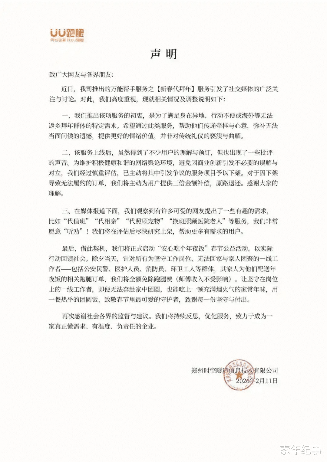 争议发酵不到三天,2 月 10 日就有网友发现,UU 跑腿 APP 上的代磕头服务已悄然下线,仅保留代贴春联和基础代拜年服务。客服当时回应称是 “页面调整优化”,后续是否上线待定。直到 2 月 11 日,运营方河南郑州时空隧道信息技术有限公司正式发布情况说明,明确表示 “为尊重公众意见,已主动下架引发争议的代磕头相关服务项目”,并承诺将优化现有代拜年服务,聚焦便民属性。