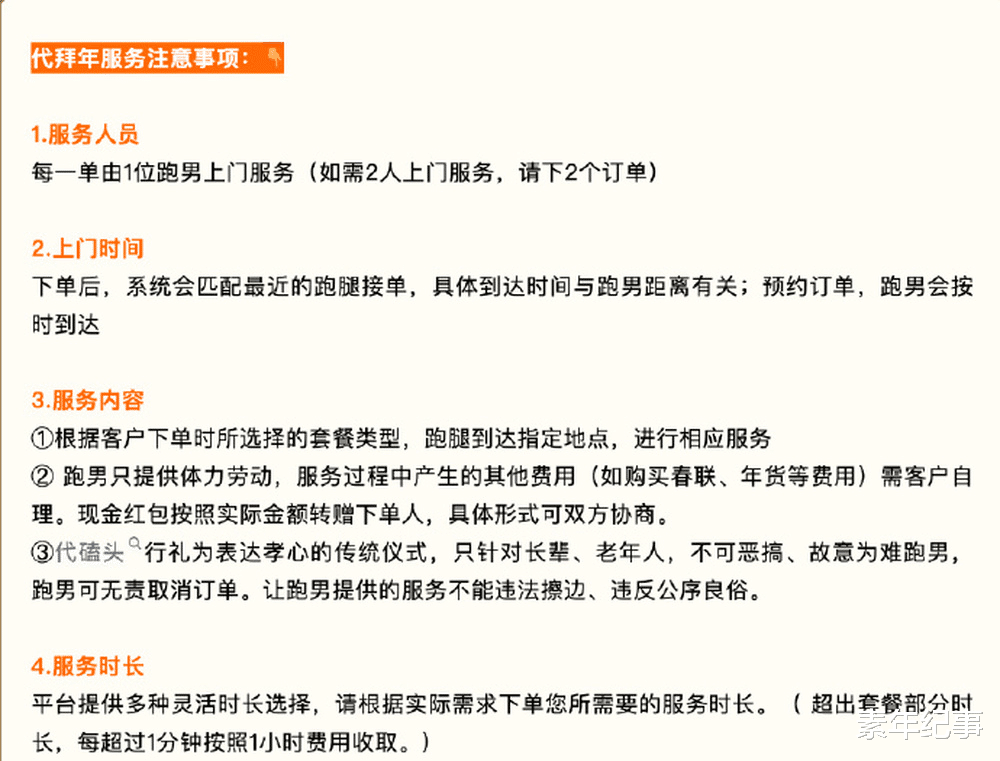 根据平台当时的宣传海报,999 元套餐堪称 “孝心打包服务”:不仅包含代买年货、上门送礼、1 分钟定制吉祥话祝福,核心亮点是 “专业跑男向长辈行传统磕头礼”,还支持实时视频直播全程,让异地用户同步见证拜年过程。平台特别标注,该服务仅针对长辈群体,禁止恶搞或为难骑手,骑手拥有无责取消订单的权利,且所有参与服务的骑手都经过专项礼仪培训。