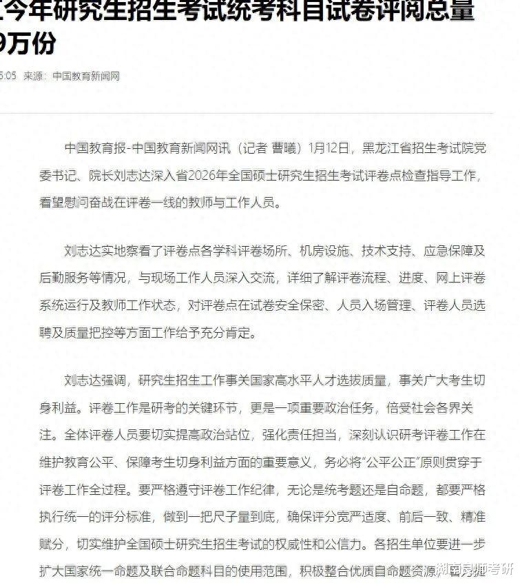 据统计,今年黑龙江省研究生招生考试统考科目试卷评阅总量达22.9万份,选聘评卷教师650名。评卷工作自2026年1月10日正式启动,至1月15日结束。根据教育部统一日程安排,该省研考初试成绩预计于2026年2月下旬公布。