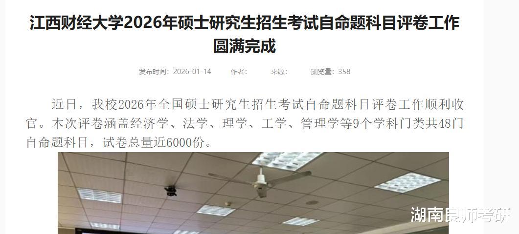 近日,江西财经大学研究生官网发布:江西财经大学2026年硕士研究生招生考试自命题科目评卷工作圆满完成,1月14日,本校已完成了自命题评卷,涵盖经济学、法学、理学、工学、管理学等9个学科门类共48门自命题科目,试卷总量近6000份。