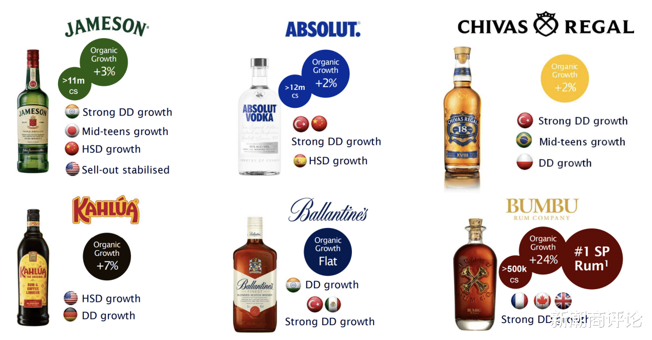 包括1988年收购爱尔兰酿酒厂——拥有尊美醇的爱尔兰威士忌生产商。1993年与古巴达成协议,成立合资企业共同经营哈瓦那俱乐部品牌,进入全球朗姆酒市场。2001年拿下施格兰的酒类业务,获得包括芝华士、格兰威特、马爹利在内的知名品牌。2005年,联手美国富俊公司收购英国联合多美,得到百龄坛、甘露、马利宝等品牌。2008年将瑞典V&S集团收入囊中,绝对伏特加成为旗下品牌。