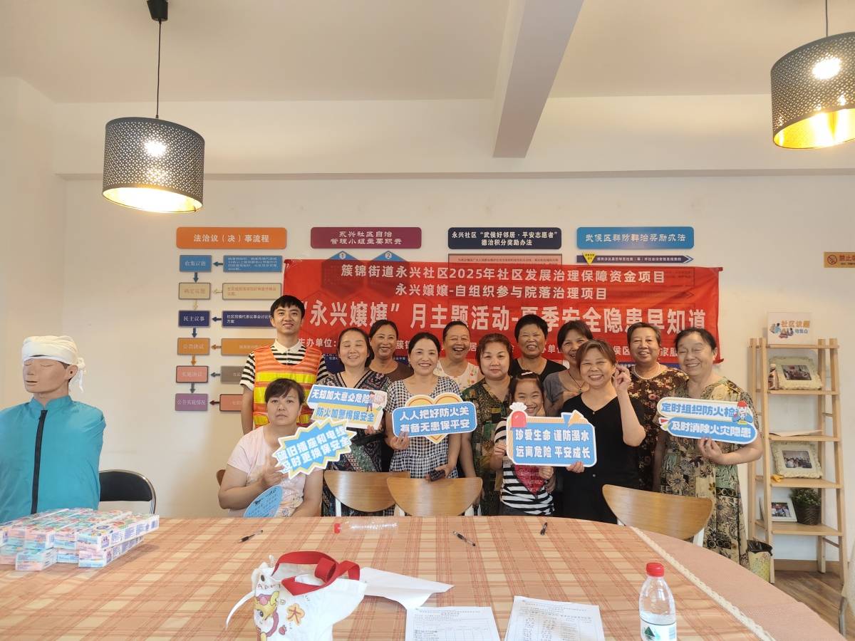 为切实提高社区居民的夏季安全防范意识,增强应对突发事件的能力,2025年7月18日上午9:30-11:30,由成都市武侯区簇锦街道永兴社区2025年社区发展治理保障资金支持,簇锦街道永兴社区居民委员会主办,成都市武侯区阳光居家服务中心承办的永兴嬢嬢-自组织参与院落治理项目-“永兴嬢嬢”月主题活动第4期-夏季安全隐患早知道在社区会议室开展。此次活动邀请了“永兴嬢嬢”自组织队伍成员、社区居民、学生共计22人参与,取得了良好的效果。