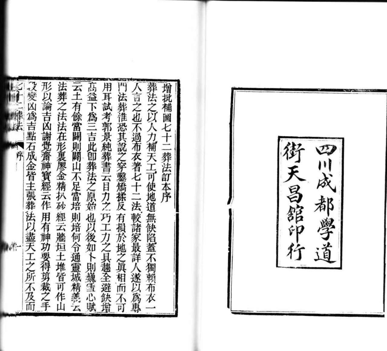 作为一部经名家增批补图的葬法典籍,该书开篇的序跋便奠定其文献价值。华阳王元极系民国时期四川知名风水大家,著有《地理辨正冒禁录》《三元真谛》等力作,其于天昌馆题写的序言,既溯源赖布衣七十二葬法的传承脉络,又结合自身实操经验补注要义,驳斥“葬法无定规”的谬论,强调“法随形变、因势择葬”的核心准则,为全书筑牢理论根基。天昌馆作为民国时期兼具文化底蕴与商业属性的场所,更让这份题跋成为佐证典籍流传脉络的重要印记,为古籍增添了厚重的时代底蕴。
