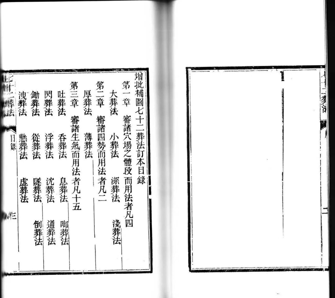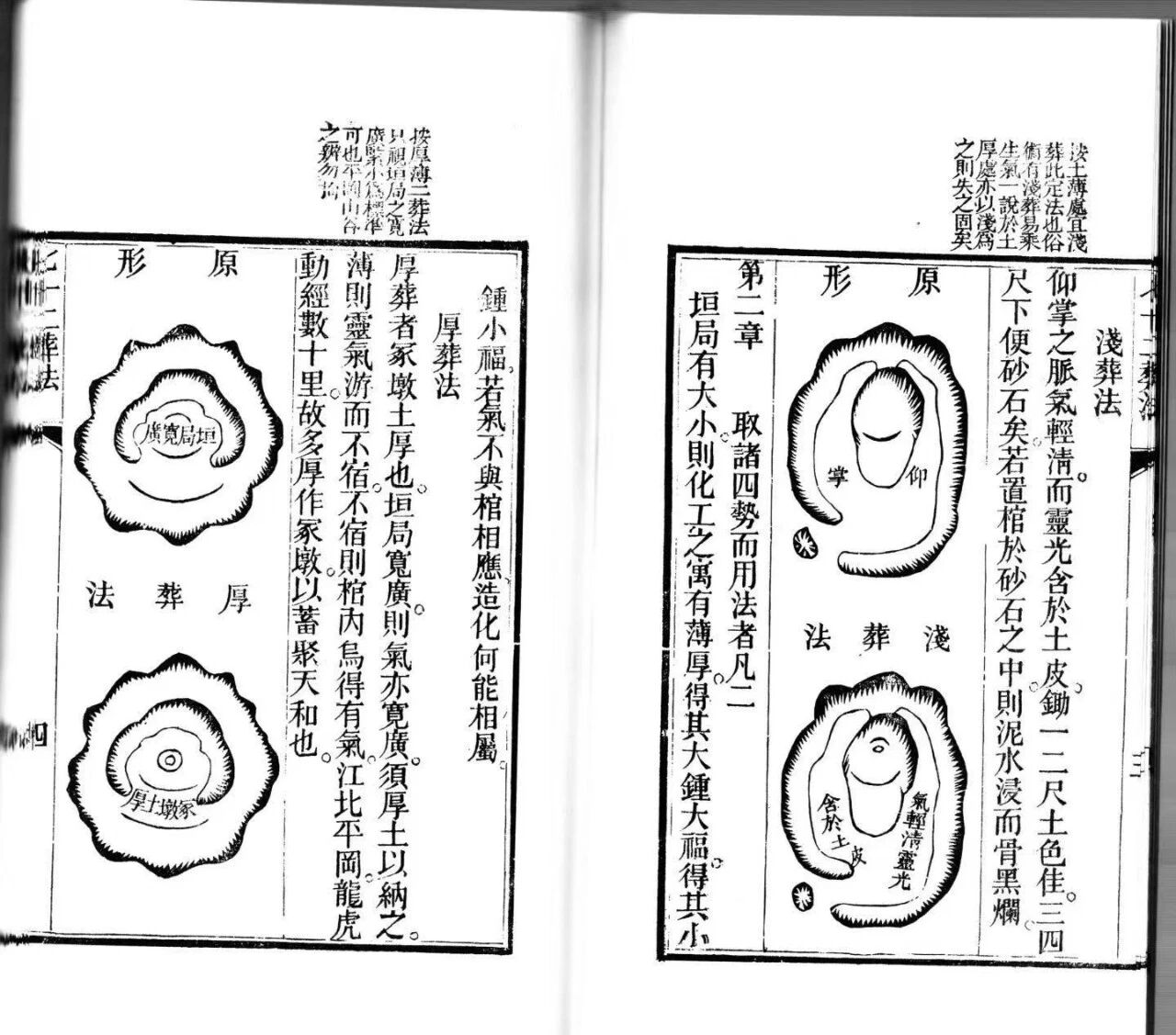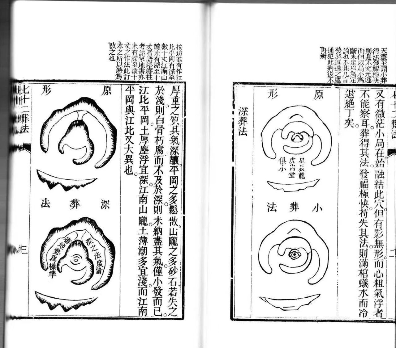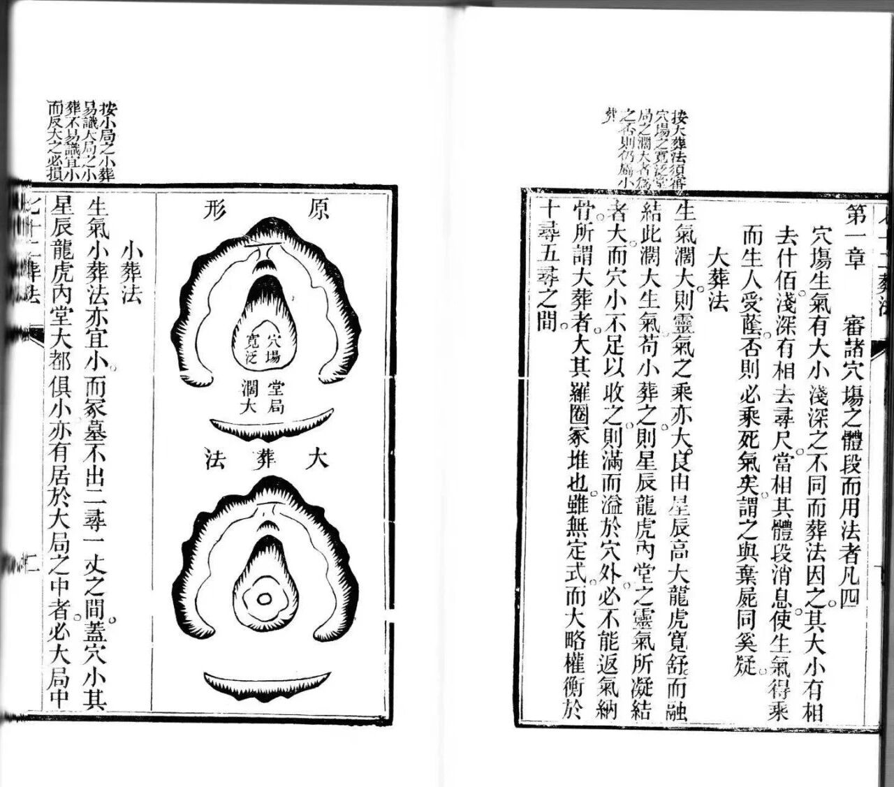黑白图示的补绘是该书的点睛之笔,全书配套图示精准对应七十二葬法,以简洁线条还原不同山川形势下的葬位布局、砂水走向与气脉流转。图示按“依龙脉、依水势、依穴形、化煞局”四类划分,如骑龙葬图示标注龙脊结穴点与龙虎砂护持范围,浮水葬图示明确棺木悬空深度与水势环抱角度,压煞葬图示拆解葬位与煞气对冲的化解逻辑,实现图文互证。图示旁附简短标注,衔接王元极增批内容,直观呈现“葬乘生气、化煞为权”的核心逻辑,即便初学者也能快速理解葬法与自然气场的适配之道。