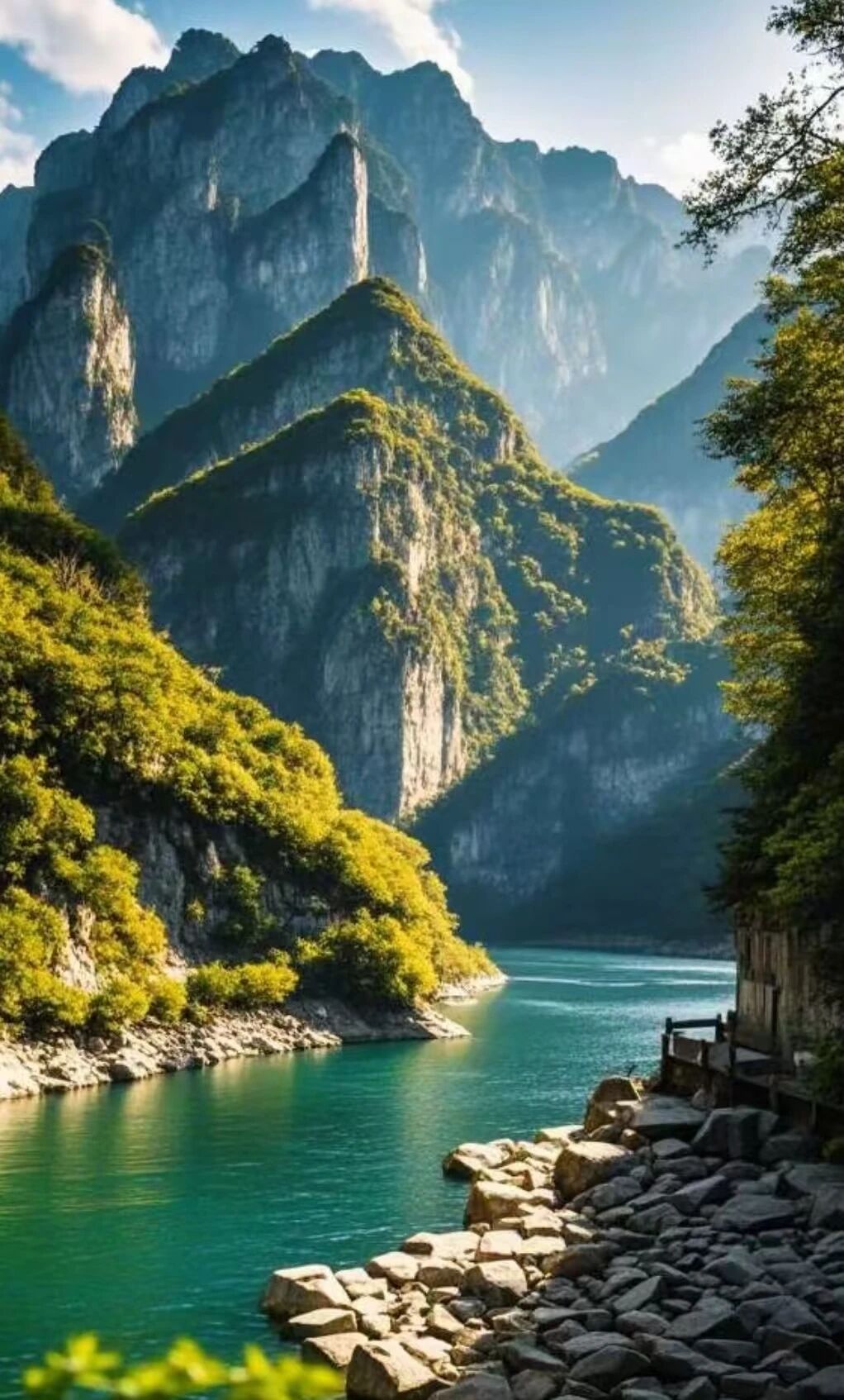峡谷纵深:使用长焦镜头,捕捉山峰倒映在碧绿湖水中的对称美景,突出峡谷的幽深与静谧。