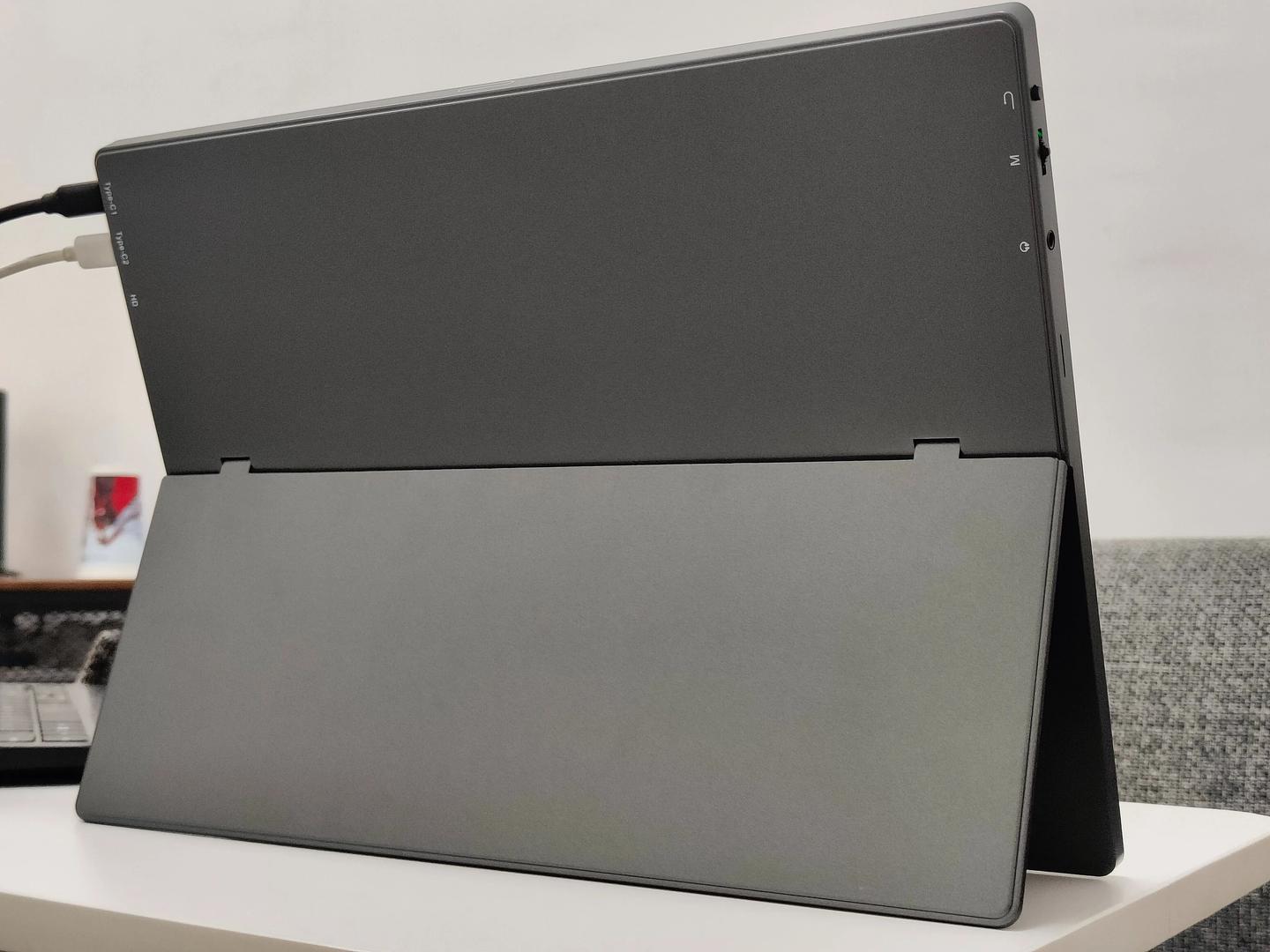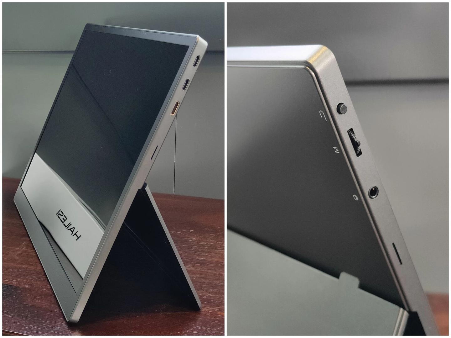 接口布局特别合理,都在机身侧边,连接线缆的时候完全不影响支架摆放。右侧是两个全功能 Type-C 口和一个 Mini HDMI 口,左侧是按键区和 3.5mm 耳机孔,日常用着特别顺手。