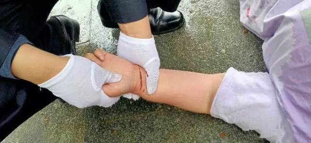 民警立即按住女子受伤的左手,以阻止流血,另外一名民警趁机果断夺下女子右手中的水果刀。