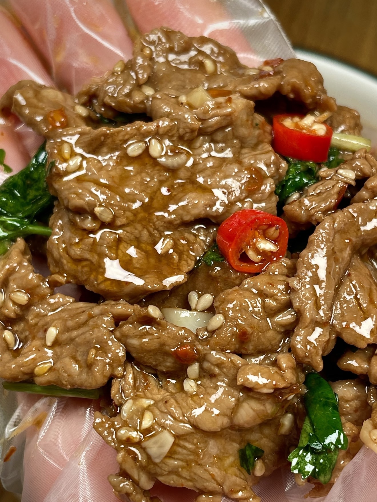 在牛肉片上撒上之前切好的香菜段,然后加入适量的蒜末、小米辣圈、生抽、香醋、白糖、盐和香油,根据个人口味调整调料的用量。最后,撒上一些熟白芝麻,增加口感和香气。