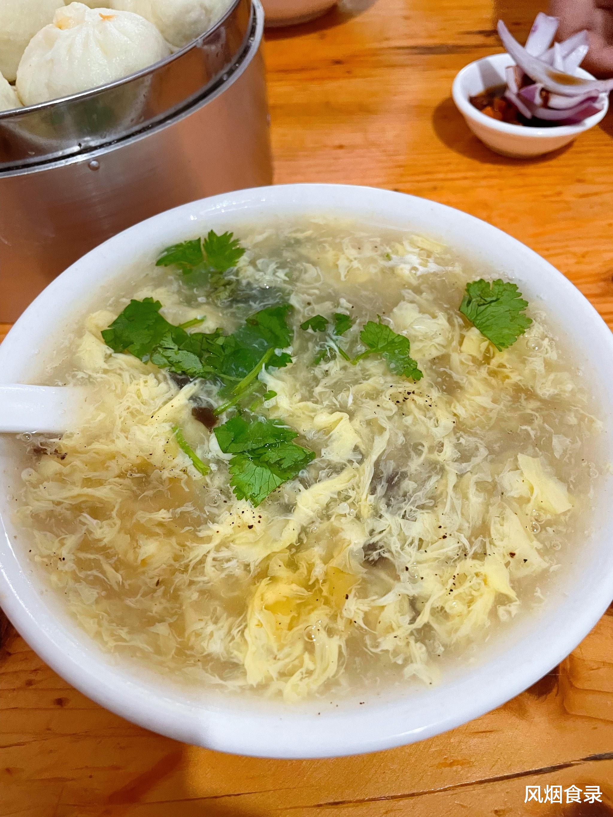 喝时打个生鸡蛋,滚汤冲成蛋花,撒把香菜淋香油,配八股油条或煎饺,