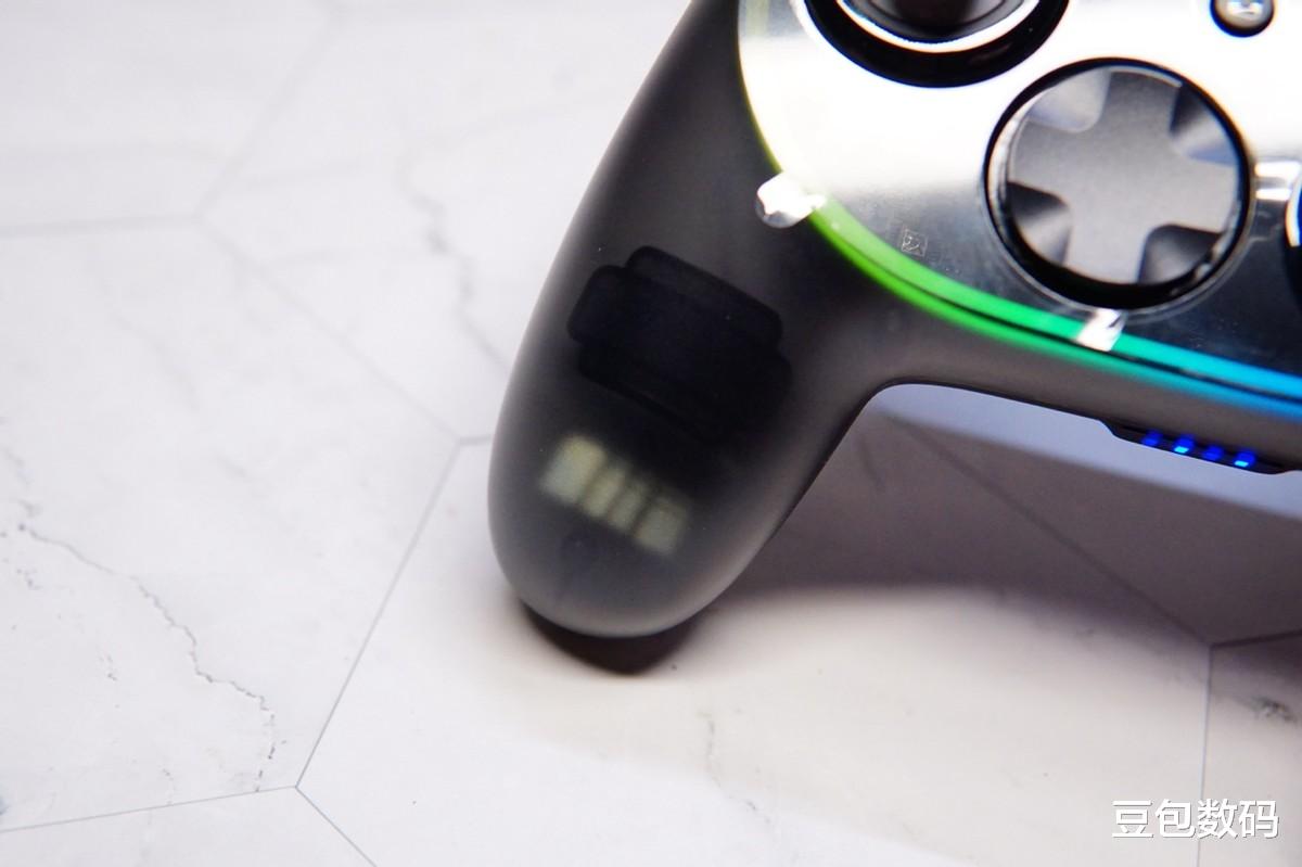 西圣GC1游戏手柄的外观设计给我带来了惊喜,半透明的机身设计,可以直接看到里面的线路板和震动马达,配合正面的彩色灯带看起来科幻感十足,平时摆在桌面上当作桌搭也是非常好看。手柄的外壳采用了NanoSkin涂层,不仅防滑的同时还不易沾染指纹,使用体验更出色。