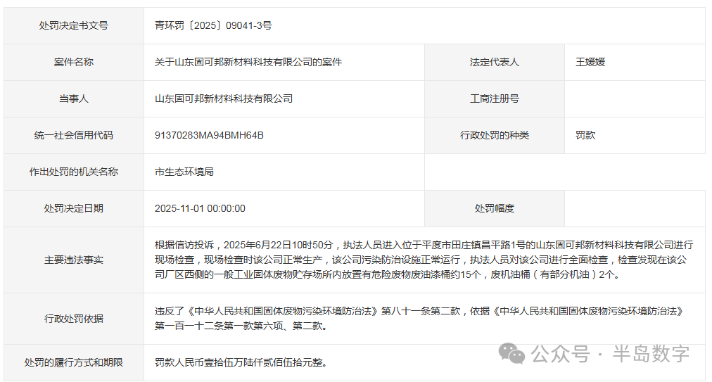 近日,半岛数字从青环罚〔2025〕09041-3号的《处罚决定书》了解到,山东固可邦新材料科技有限公司因工业固体废物贮存不当被青岛市生态环境局处罚。