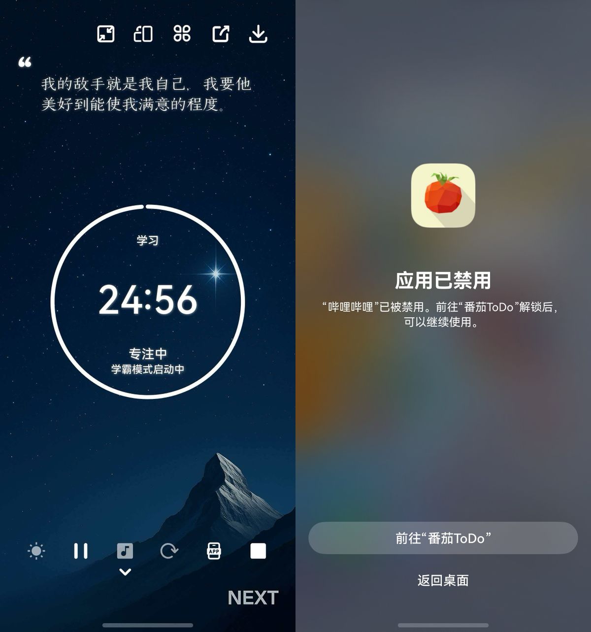 之前我也用过不少专注App,全靠自觉,根本没用。但鸿蒙版番茄ToDo的学霸模式,是真的不一样,直接治服拖延症!只要一开启,直接系统级拦截其他App,想刷视频、玩游戏?直接弹窗“应用已禁用”的警告,就算返回桌面也没用,手机瞬间变专属学习机,彻底拒绝诱惑。