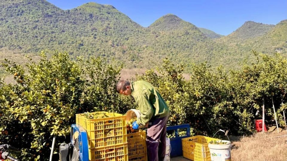 果园里,金黄色的果实挂满枝头,在阳光下泛着诱人的光泽。工人们穿梭其间,手指翻飞,圆润饱满的果实纷纷落入桶中,一派繁忙的丰收景象。
