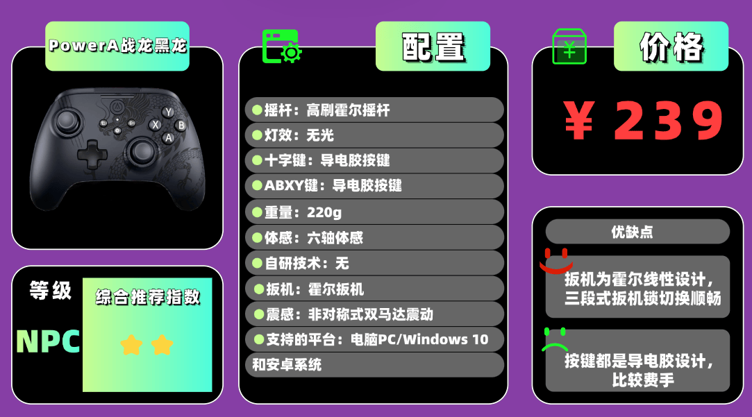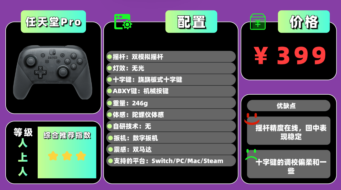 功能方面,在Switch平台原生适配良好,连接稳定且延迟低;PC/Mac端通过蓝牙连接也十分方便,Steam可直接识别,无需额外驱动。内置电池续航约40小时,日常长时间游戏基本无需频繁充电。