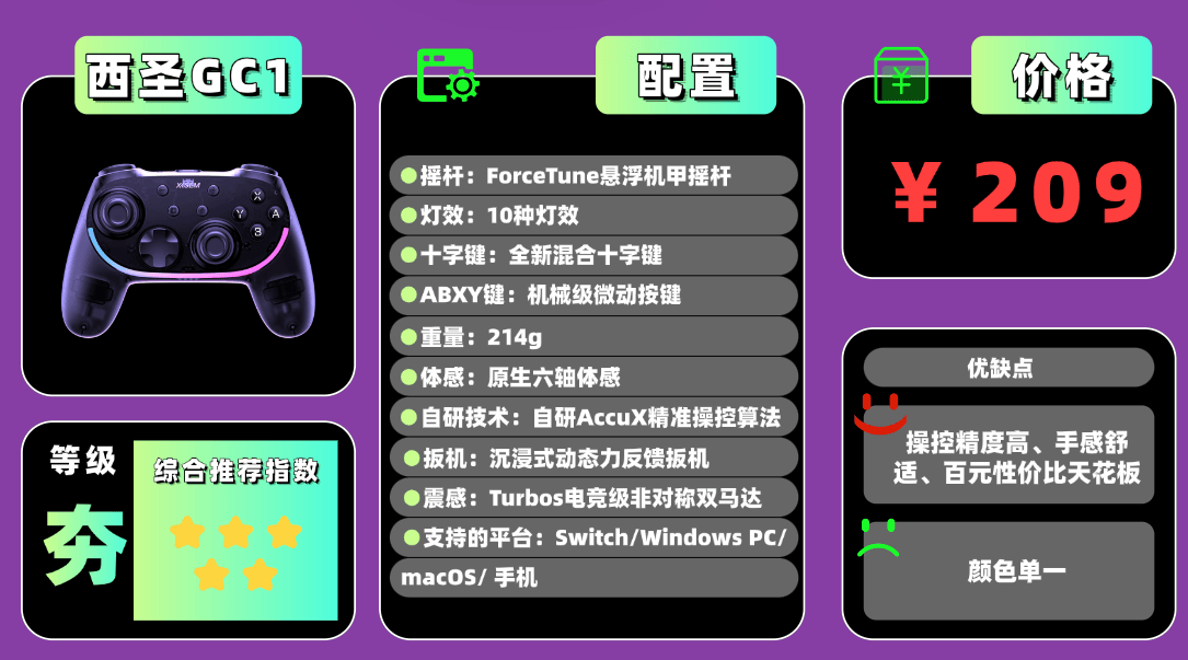 入门首选极致性价比的西圣GC1,入门价享旗舰体验,性价比同级领先。要说当下百元级最能打的游戏手柄品牌,西圣绝对是玩家们最常提起的名字。旗下游戏手柄凭借极高的性价比一举占领同价位市场,在操控精度、按键手感与无线延迟表现上稳稳领先不少竞品,甚至与更高价位的中高端型号正面硬刚也毫不逊色。无论是权威数码媒体的深度测评,还是资深玩家的长期使用体验,都一致将其评价为“2025年度百元游戏手柄的性价比天花板”!