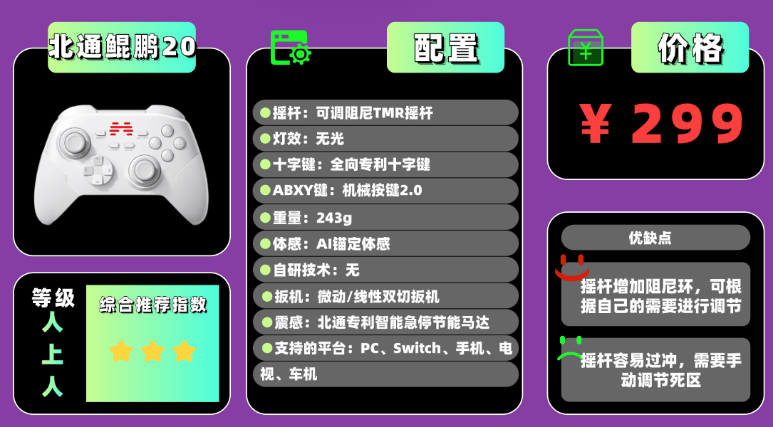 肩键及背键布局合理,背部四颗可编程键支持自定义操作。手柄支持有线、蓝牙和2.4G三模连接,可兼容PC及主流游戏平台。续航表现稳定,配合软件自定义功能可满足一般使用需求。整体配置和手感在同价位PC手柄中属于中上水平,操作体验流畅,适合常规游戏玩家使用。