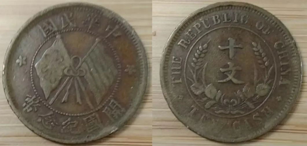 中华民国“开国纪念币”以设计美观、制造精美、重量适中、币值适用,而受到广大百姓的认可、欢迎。今天对于货币研究者、收藏者来说却是很重要的一个币种,也可以说是中华民国铜元的主体品种。此枚中华民国双旗“开国纪念币”,正面珠圈内镌双旗图案,为交叉五色旗与铁血十八星旗,上方写着“中华民国”四字,下方则为“开国纪念币”字样,左右两边镌两朵瑰丽的梅花,背边内圈中心刻“十文”两字,两边分别辅以嘉禾,为丰硕、美好、祥瑞的意思,上方英文是“THE REPUBLIC Of CHINA”,下为“TEN CASH”, 全意为中华民国“开国纪念币”十文,此币造型美观,版面设计优雅,轮廓周正,铜质熟旧深沉,包浆自然,钱文深俊,字型端庄,笔画粗细得当,笔锋婉转到位。整体质地精良,形制规整,工艺精细,纹理凹凸有致,图案浮雕感强烈,钱币流通痕迹明显,见证了其历史的积淀,历史特征显著,加之实物存世甚少,价值珍贵,为中国机制币中的珍品。具有很高的历史价值、艺术价值和收藏价值。