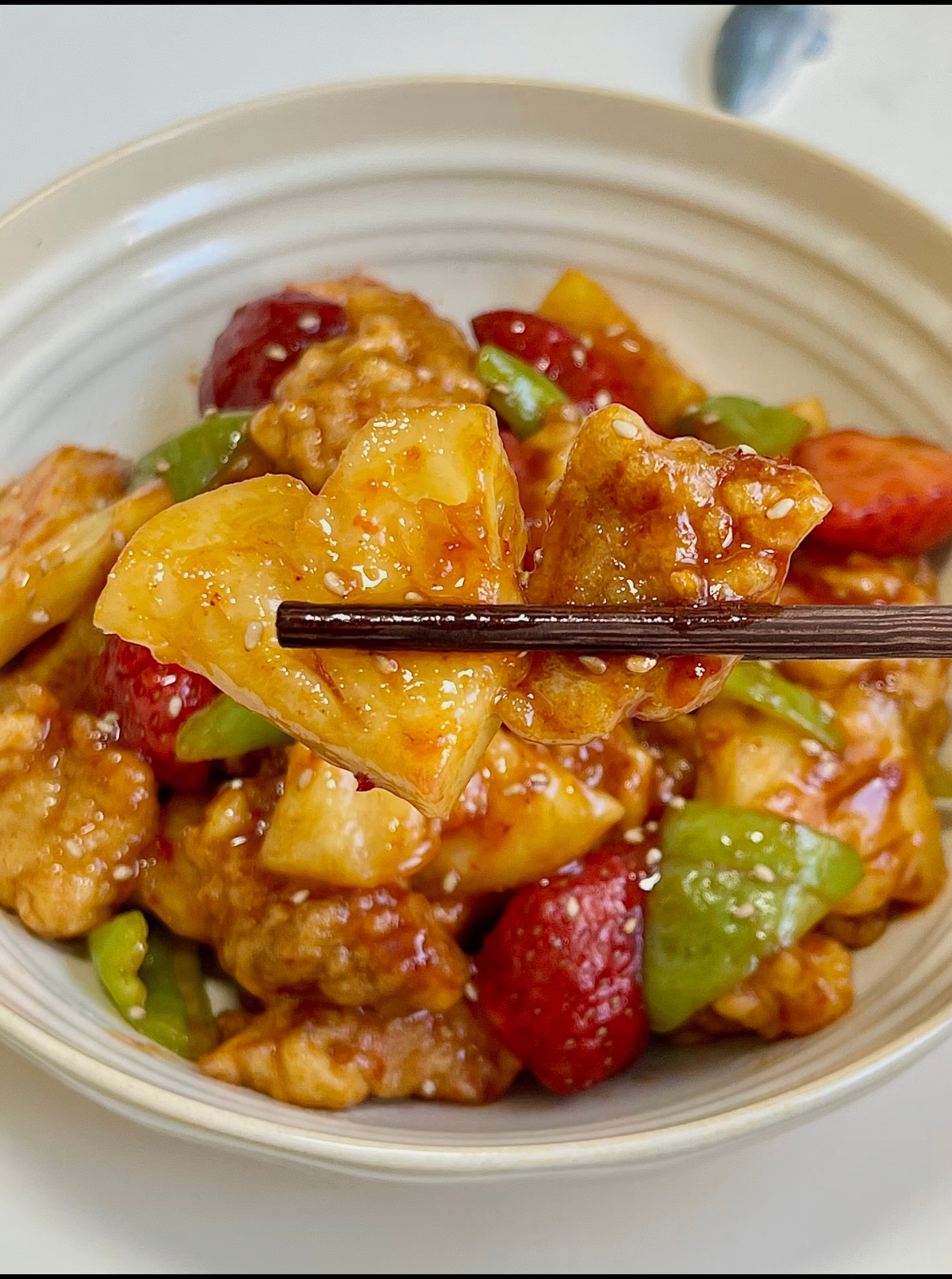 看着这盘热气腾腾、色泽鲜亮的咕咾肉,夹起一块送入口中,首先是外壳的酥脆,紧接着是里脊肉的嫩滑,最后是草莓与菠萝交织的酸甜果汁在口腔中爆开,层次丰富得让人欲罢不能。这道菜不仅征服了挑剔的大人,更是孩子们的最爱,那酸甜开胃的口感,丝毫不腻,绝对是妥妥的“下饭神器”。在这个草莓正当季的时节,不妨为家人露一手,让这道充满创意与心意的草莓菠萝咕咾肉,成为餐桌上最抢眼的主角,让那份酸甜的幸福滋味,温暖每一个平凡的日子。