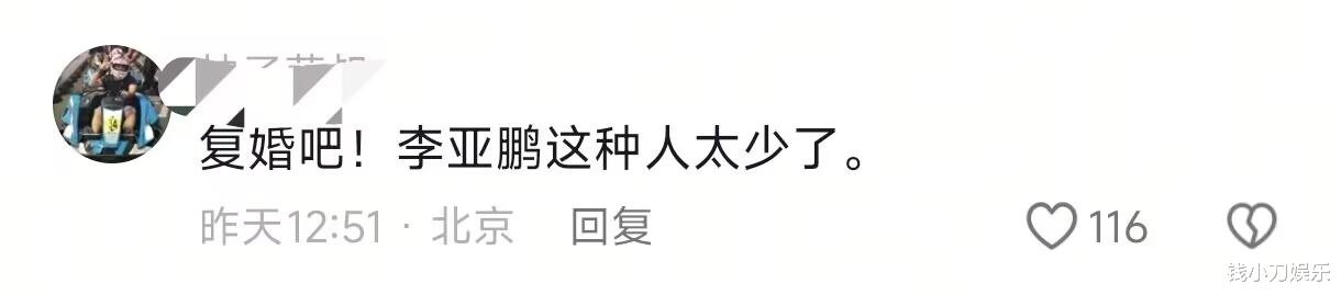 让他复婚的理由也是五花八门,有人说应该给孩子一个完整的家,有人说李亚鹏是难得的好人,有人要求他们复婚后去她的老家,她要给李亚鹏和海哈金喜放烟花。