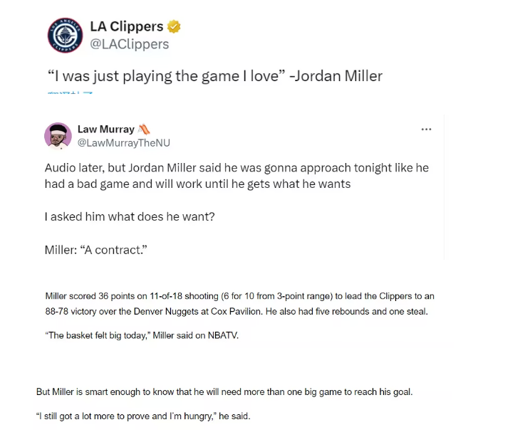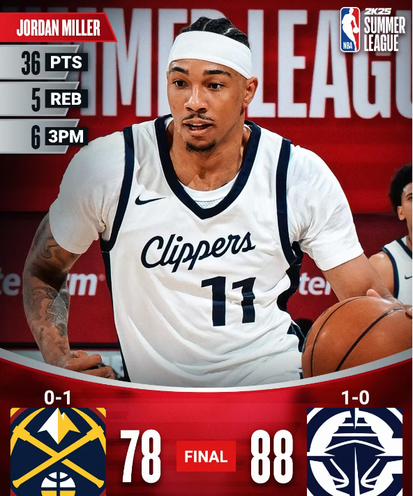 北京时间 7 月 13 日,NBA 夏季联赛激战正酣,快船队以 88 - 78 击败掘金队。此役,快船队球员乔丹-米勒表现惊艳,出战 30 分钟,18 投 11 中,狂砍 36 分 5 篮板 1 助攻 1 抢断,在场正负值高达 +19。
