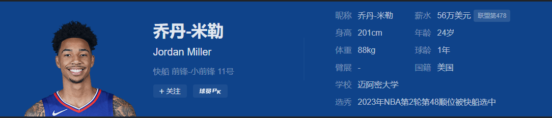 乔丹-米勒在 2023 年 NBA 选秀大会上于第二轮总第 48 顺位被快船队选中,并在上赛季与球队签下一份双向合同。在 2023 - 24 赛季常规赛,他为快船队出战 8 场,场均出战 3.5 分钟,能够得到 1.6 分 0.6 篮板,投篮命中率 55.6%,三分球命中率 50.0%。