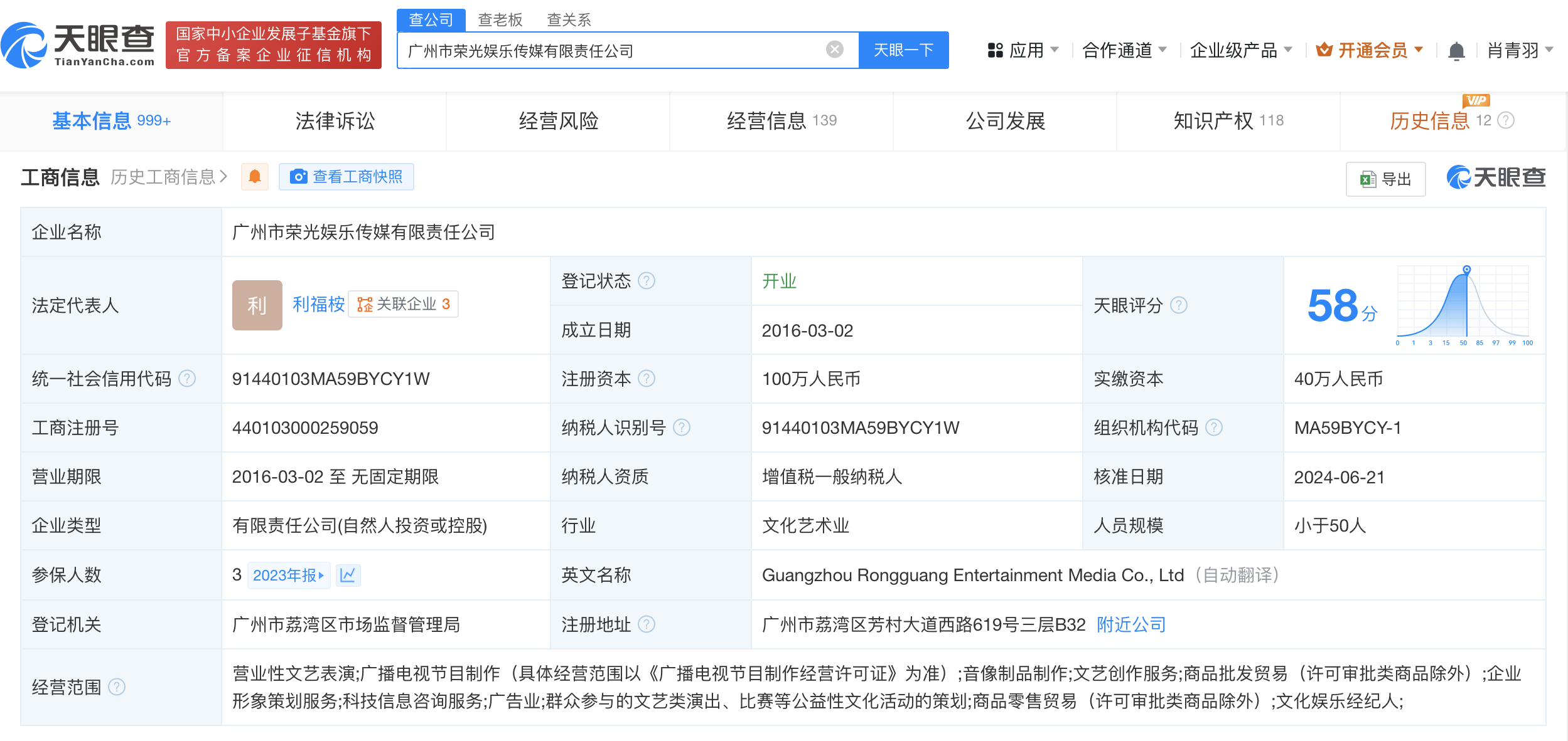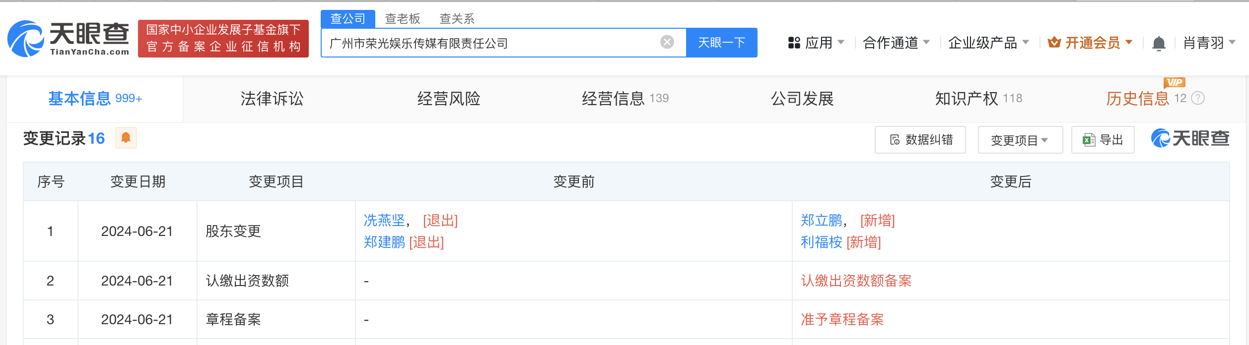 天眼查App显示,“大狼狗郑建鹏言真夫妇”账号关联的广州市荣光娱乐传媒有限责任公司成立于2016年3月,法定代表人为利福桉,注册资本100万人民币,经营范围包括营业性文艺表演、广播电视节目制作、商品批发贸易、商品零售贸易等,由郑立鹏、利福桉共同持股。变更记录信息显示,今年6月,“广东夫妇”郑建鹏与冼燕坚已退出该公司股东行列。知识产权信息显示,该公司已注册多枚“言真夫妇”“大狼狗郑建鹏”商标。