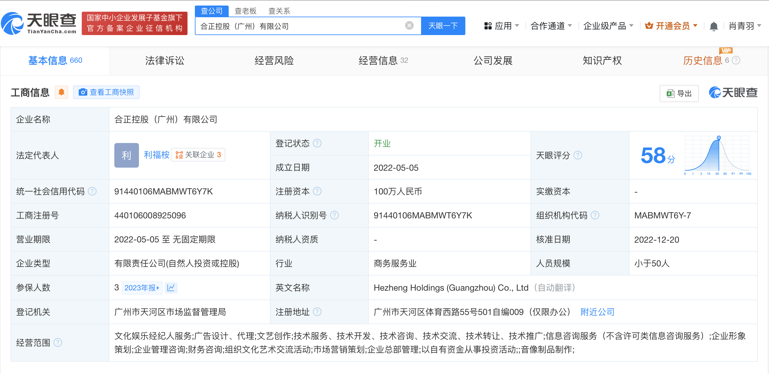 此外,“广东夫妇”二人共同还有1家存续企业,为合正控股(广州)有限公司。该公司成立于2022年5月,注册资本100万人民币,由利福桉任法定代表人,冼燕坚任监事,郑建鹏、冼燕坚合计持股99.9%,利福桉持股0.1%。