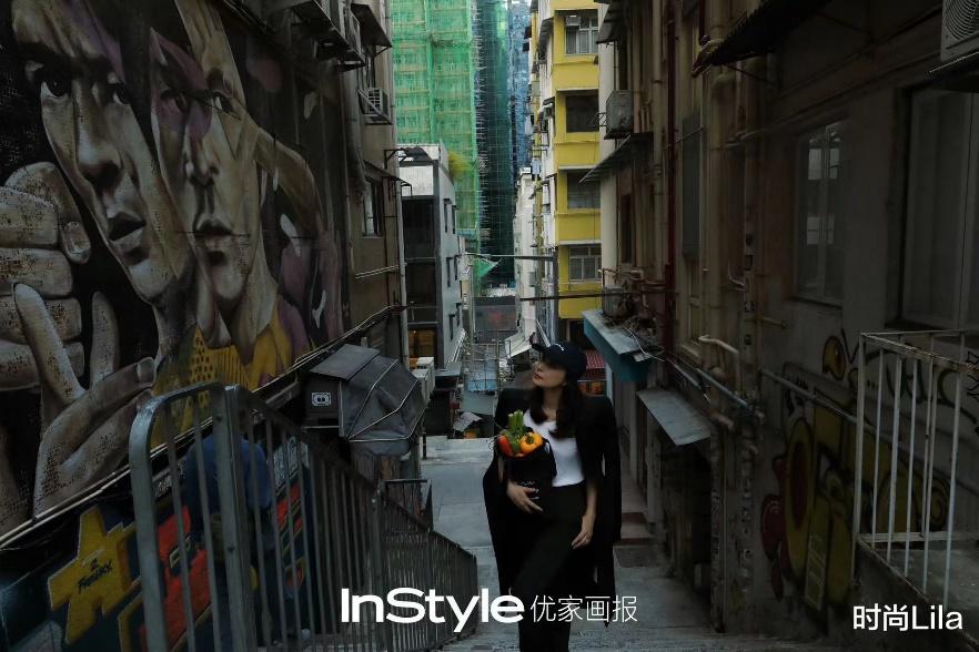 而比起公交车上的文艺画风,郭晶晶这次的黑色大衣+鸭舌帽的打扮偏冷酷沉稳一些,单手提着装满蔬菜水果的黄油袋,安静的穿梭于涂鸦艺术街头的氛围,整个风格虽孤独,却很祥和浪漫。