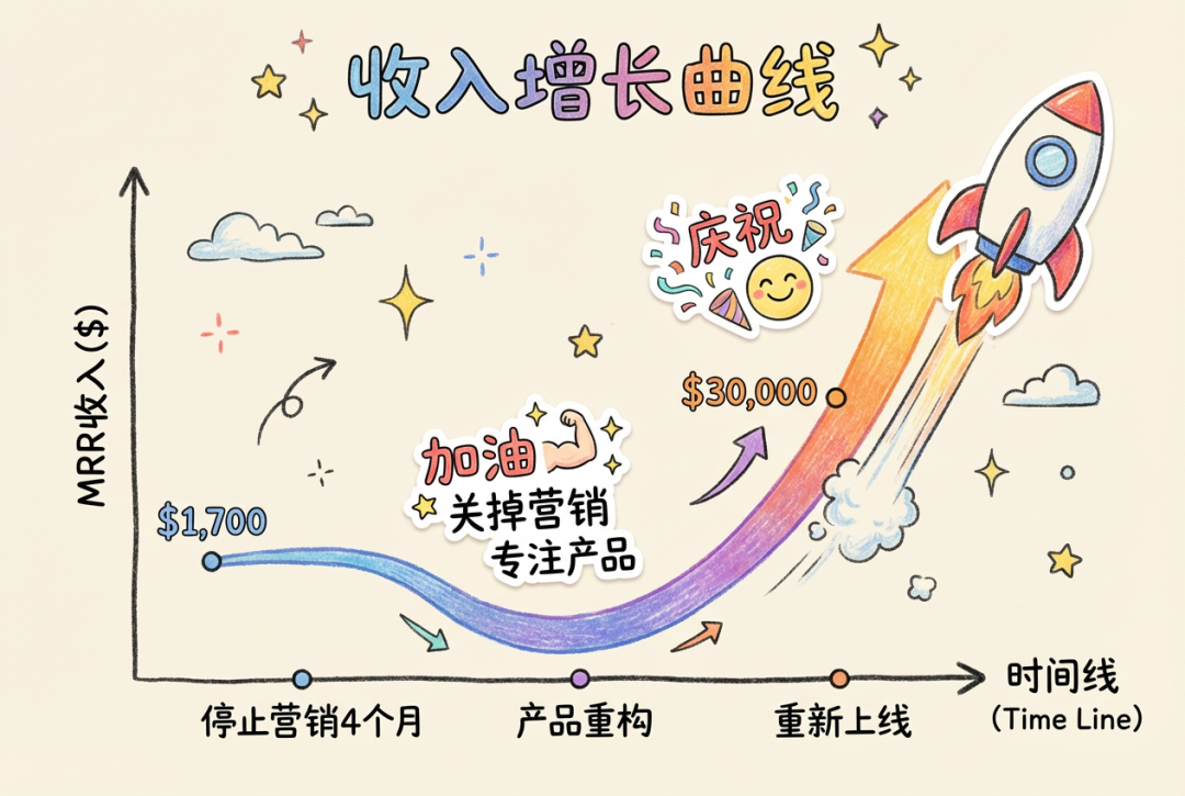 2024年4月重构版上线,初始月收入1.7万美元、日下载15个,但试用转付费率飙升至50%+,单下载收益3.3美元,产品验证通过。重启营销后,通过三步实现爆发: