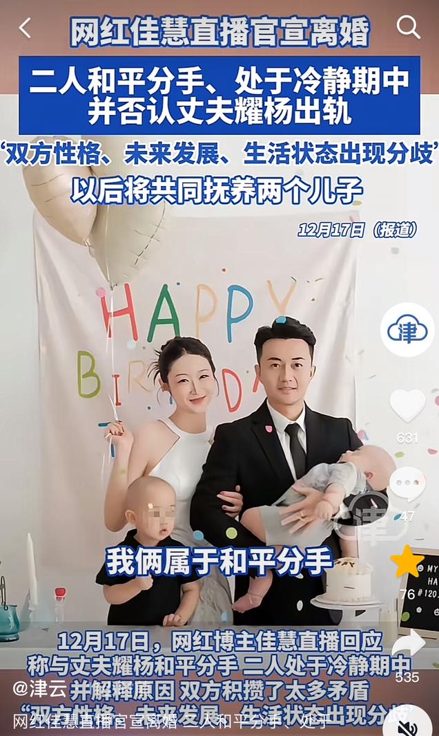 早前,知名网红佳慧因在短视频账号上分享文案“和平分手”,由此惹来外界网友非议。虽说本人没有直接性表明,但细节之处还是让人浮想联翩,包括所谓的离婚原因。