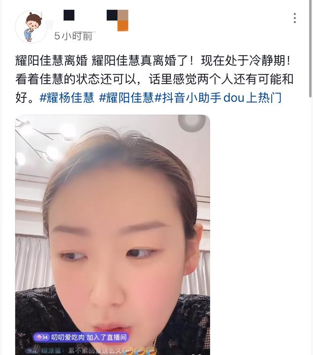 据了解,佳慧与耀杨(耀阳)是有登记结婚证的,所以说离婚至少需要一个月的冷静期,佳慧在直播的时候也表示“现在处于冷静期”。