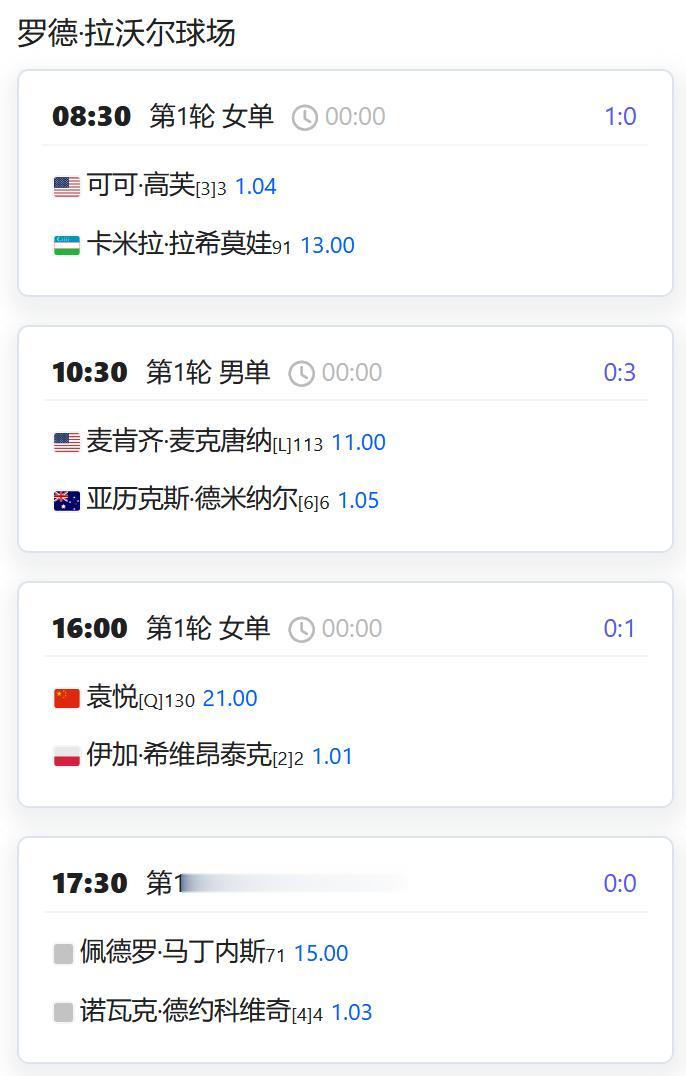 罗德拉沃尔球场,第一场女单由赛会3号种子高芙,对阵转籍乌兹别克斯坦的拉希莫娃。